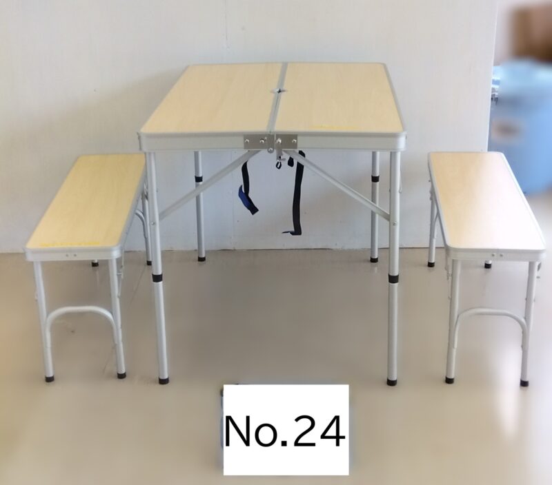 | 品番:No.24 | 品名:アウトドア折りたたみテーブル・ベンチ ウォータージャグセット | 価格:1000円 | 規格横幅:90cm | 高さ:70cm | 奥行:66cm | ||