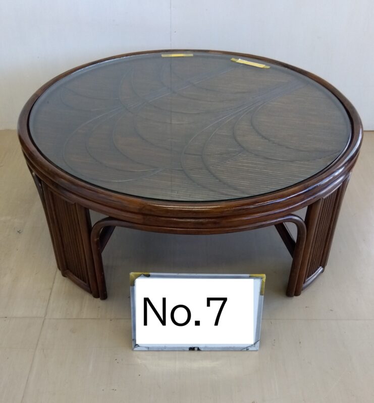 | 品番:No.7 | 品名:ラタンラウンドガラステーブル | 価格:300円 | 規格横幅:90cm | 高さ:37cm | 奥行:90cm |