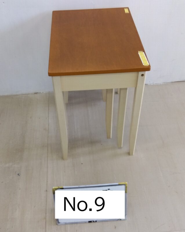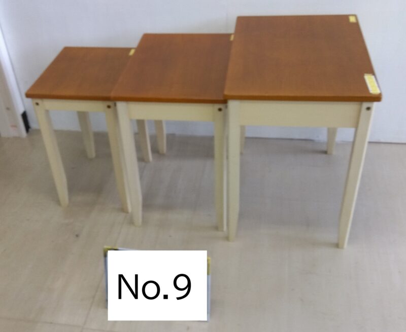 | 品番:No.9 | 品名:ネストテーブル | 価格:400円 | 規格横幅:34.7cm | 高さ:48.4cm | 奥行:28.6cm | ||